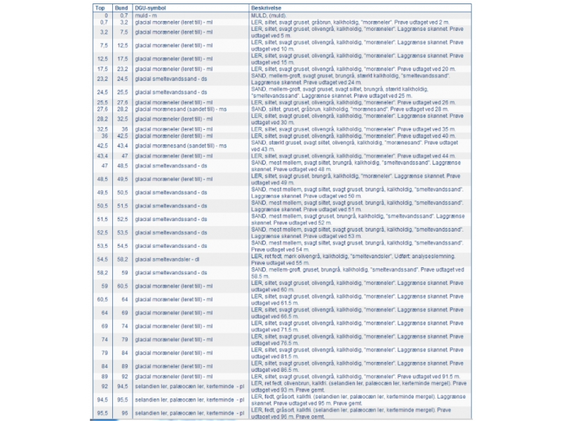 Vandet hentes i vores 2 boringer, og som det kan ses af nedenstående skema hentes vandet dybt nede og er godt beskyttet af et tykt lag moræneler.